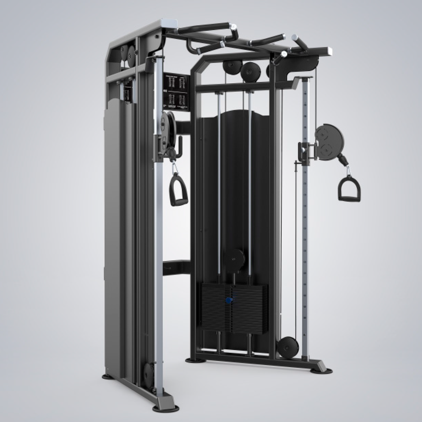 ● A altura da alça facilmente ajustável em ambos os lados da polia permite o ajuste com uma mão, e as marcações gravadas a laser fornecem alinhamento preciso. A pilha de peso de 95 kg em ambos os lados fornece uma proporção de 2:1 de potência para resistência, fornecendo peso suficiente para diferentes exercícios.